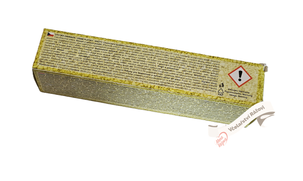 Sirné knoty sloužící k desinfekci úlů při takzvaném vysiřování. Za pomoci těchto knotů, které se používají ve vysiřovací lampě se desinfikuje především souš, nástavky, rámky či další včelařské potřeby. S jejich pomocí můžete dezinfikovat i potřeby pro manipulaci a uskladňování medu, jako jsou sudy, nádoby či větší skladovací zařízení. Sirný dým ničí plísně a nebezpečné mikroorganismy. Balení obsahuje papírové proužky, na kterých je nanesena síra. Tyto proužky se věší na drát v sirné lampě a zapálí se. Obvykle se nechávají působit delší dobu, minimálně hodinu, obvykle ale klidně i dvě či více. Velikost balení je 400 gramů. Upozornění: Při hoření se uvolňuje oxid siřičitý, toxický plyn, CAS 7446-09-05. R-23 -toxický při vdechování. R-34 -způsobuje poleptání. S1/2 - uchovejte mimo dosah dětí.S26 -při zasáhnutí očí oxidem siřičitým okamžitě důkladně vypláchněte vodou a vyhledejte lékařskou pomoc. S39 - používejte osobní ochranné prostředky (brýle, štít, rukavice). S45 - v případě nehody, nebo necítíte-li se dobře, vyhledejte lékařskou pomoc.