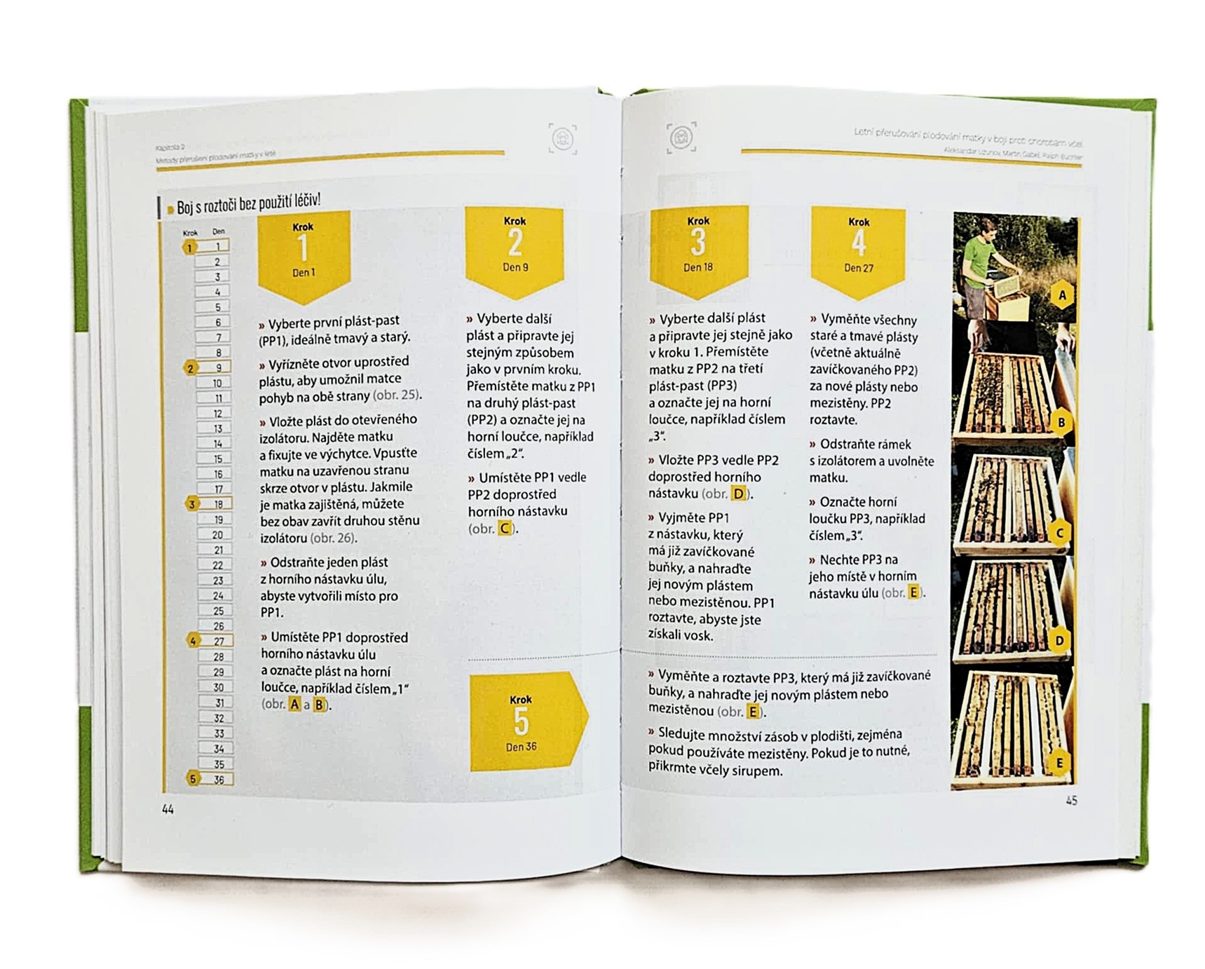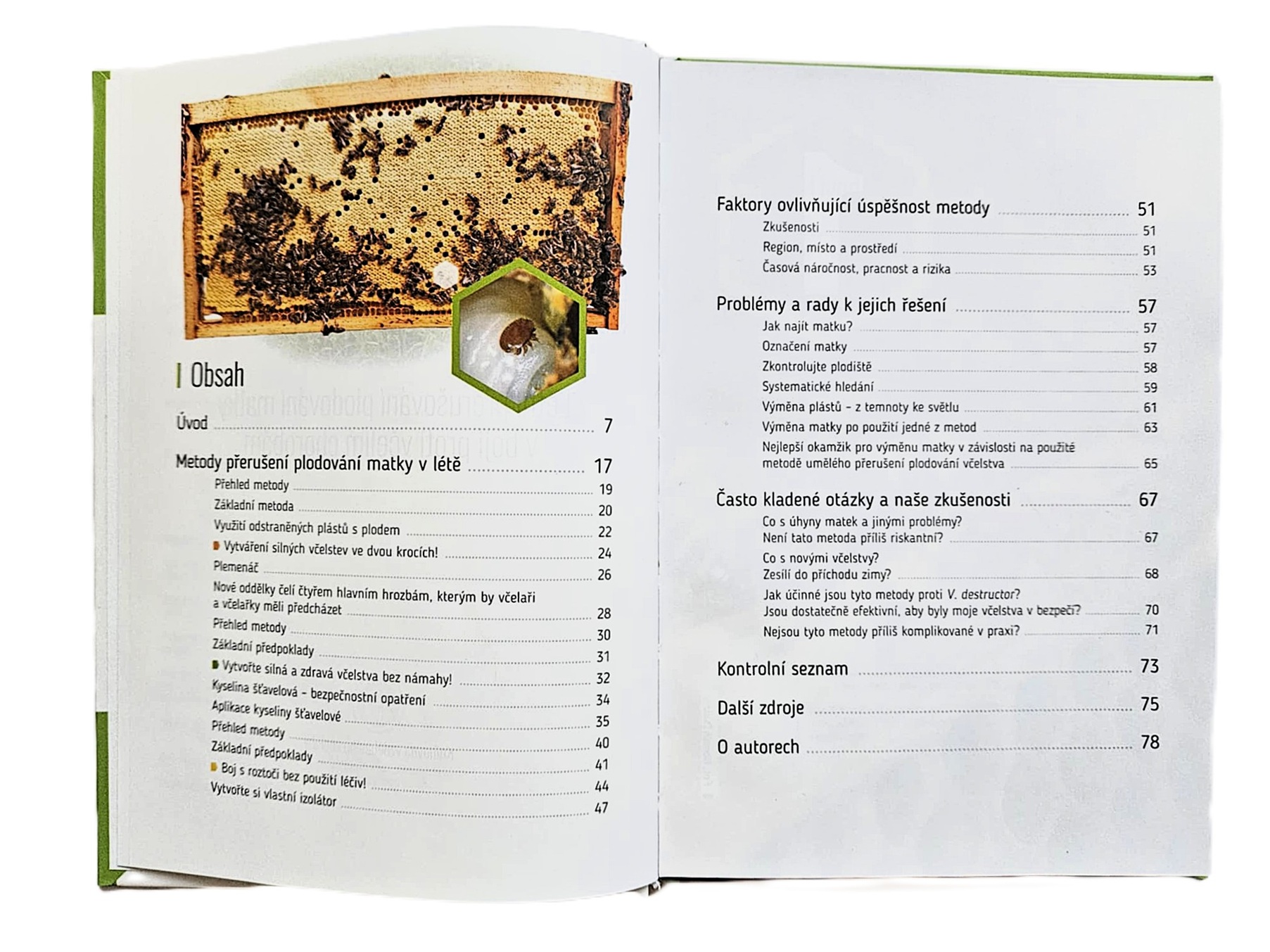 Na základě hlubokých znalostí o biologii včel popisujeme tři různé metody regulace populace V. destructor, založené na letním přerušení plodování matky. Jsou to: odstranění plodu, uzavření matky do klícky a izolace plástů. V knize jsme zahrnuli mnoho praktických rad, jak snížit riziko ztráty matky nebo kolapsu včelstva při provádění těchto opatření.