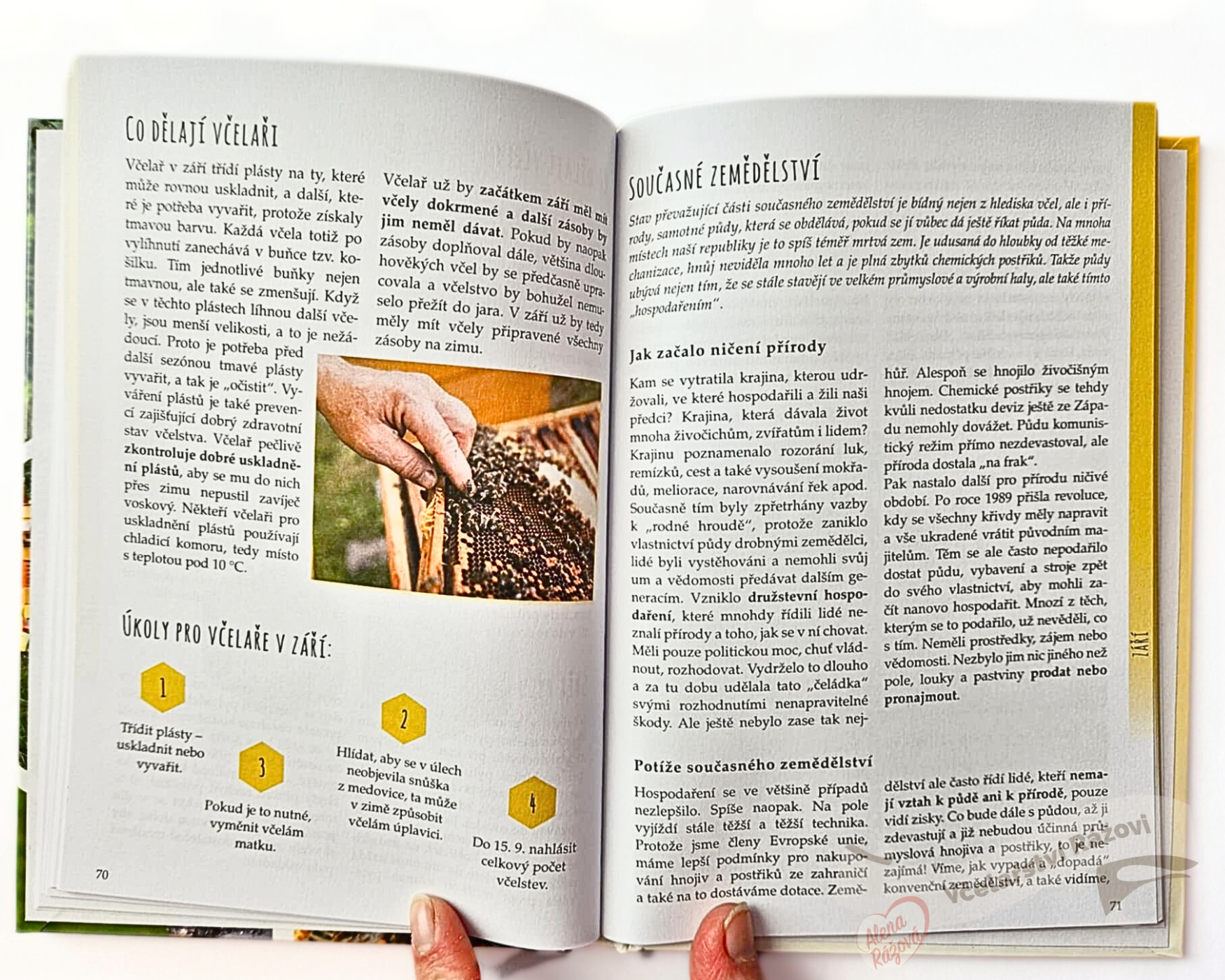 Kniha je čtivý a praktický průvodce, který vás provede fascinujícím světem včel od jarního probuzení až po zimní odpočinek.. Kniha je napsána s hlubokou úctou a láskou ke včelám, které se autor věnuje přes 50 let. Je ideální jak pro úplné začátečníky, tak pro lidi, které včely prostě jen zajímají a chtějí pochopit jejich význam pro přírodu.