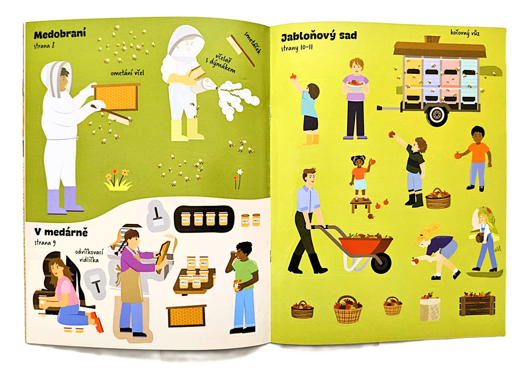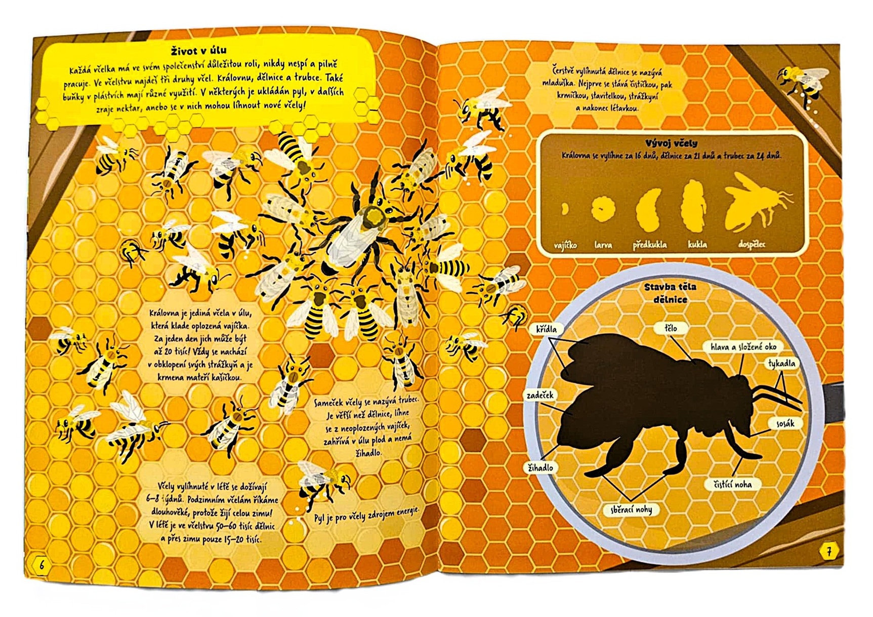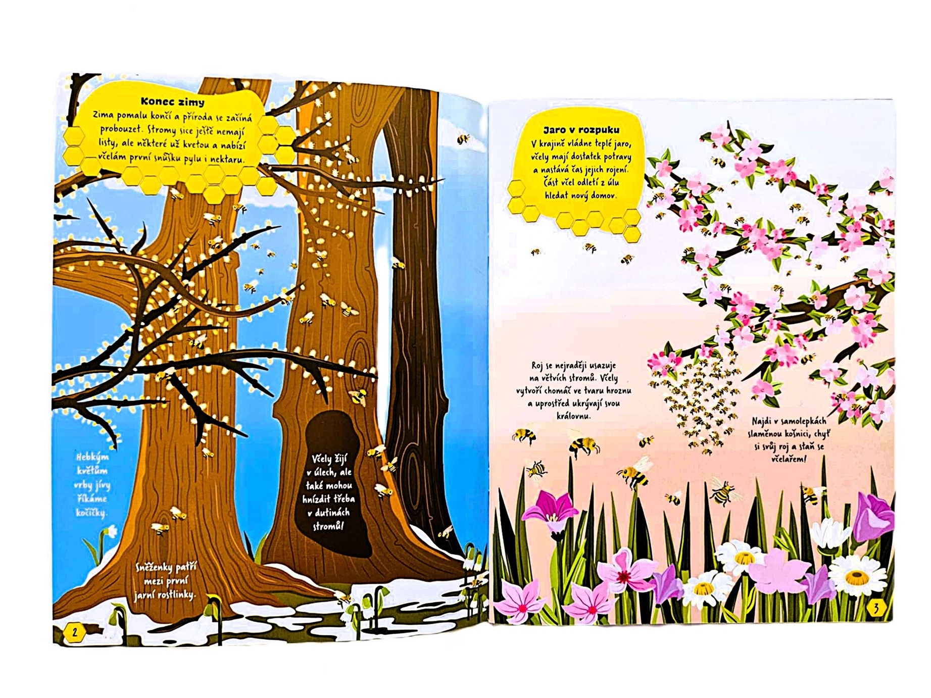 Tato knížka je pro děti interaktivní formou seznámení s tématem včelstva a života včel. Kombinuje lepení samolepek se zábavnou/naučnou formou. Díky samolepkám jsou děti aktivně zapojeny - počínaje líčením scén, doplňováním obrázků a témat, které se týkají včel: včelí úly, práce včelaře, včelí med atd. To podporuje jemnou motoriku - lepení samolepek, vizuální vnímání a zvídavost k přírodě.