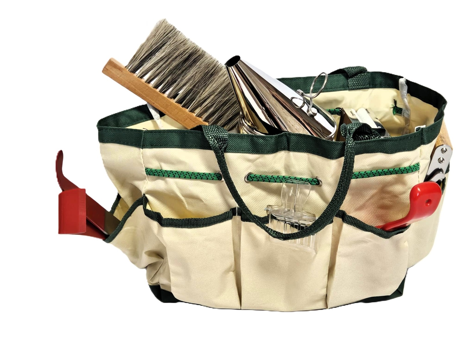 Každý včelař ví, že u úlu je třeba mít vše potřebné pěkně po ruce. Tato praktická včelařská taška je nabitá vším, co potřebujete pro každodenní práci se včelami. Díky promyšlenému rozvržení kapes a dostatečnému prostoru pojme všechny základní pomůcky - od dýmáku, rozpěráku, rukavic až po zápisník či láhev s vodou, které chcete mít stále po ruce. Taška je vyrobena z odolného a snadno omyvatelného materiálu. Pevná ucha zajišťují pohodlné nošení ať už jdete k úlu za domem nebo vyrážíte do terénu na včelnici.