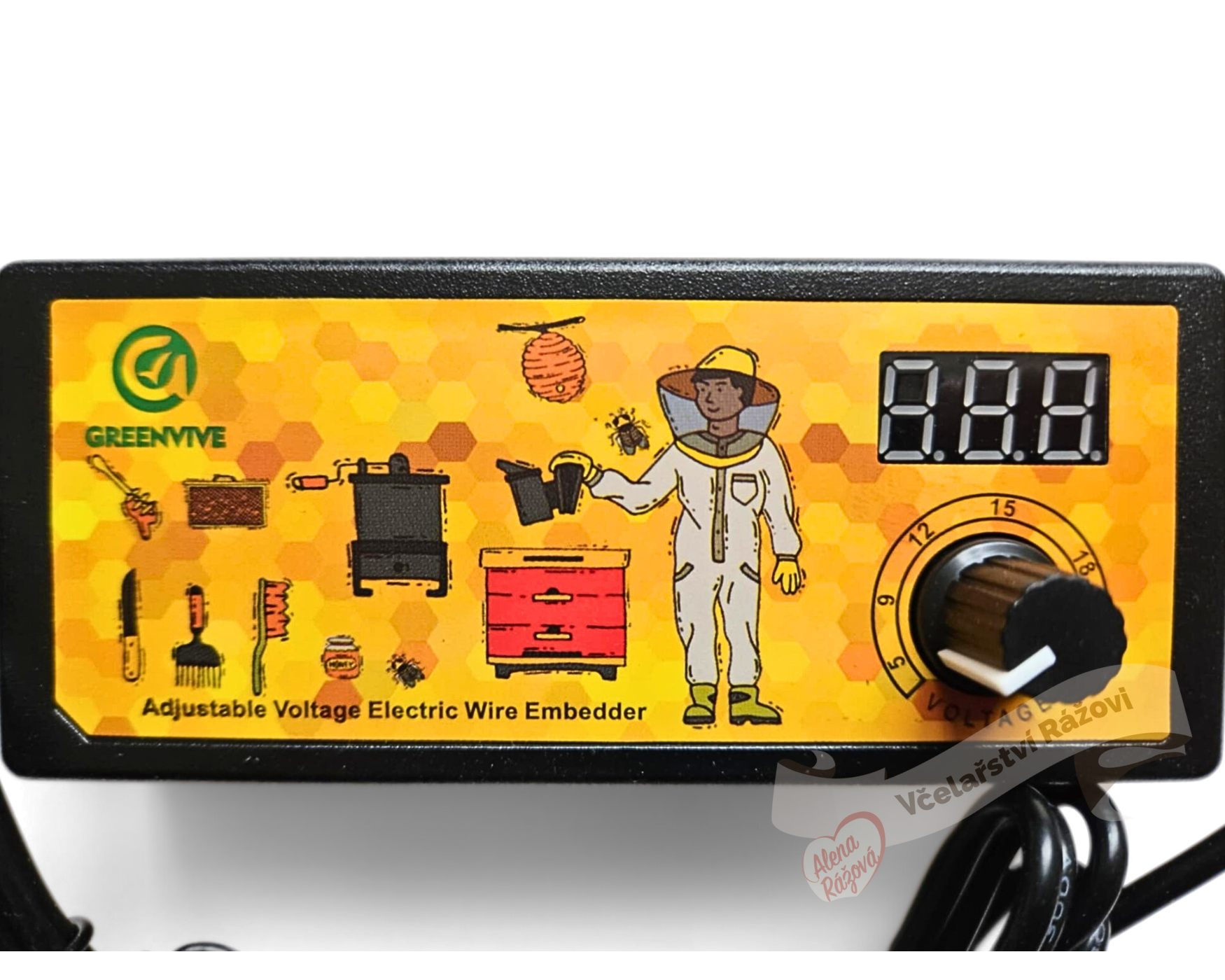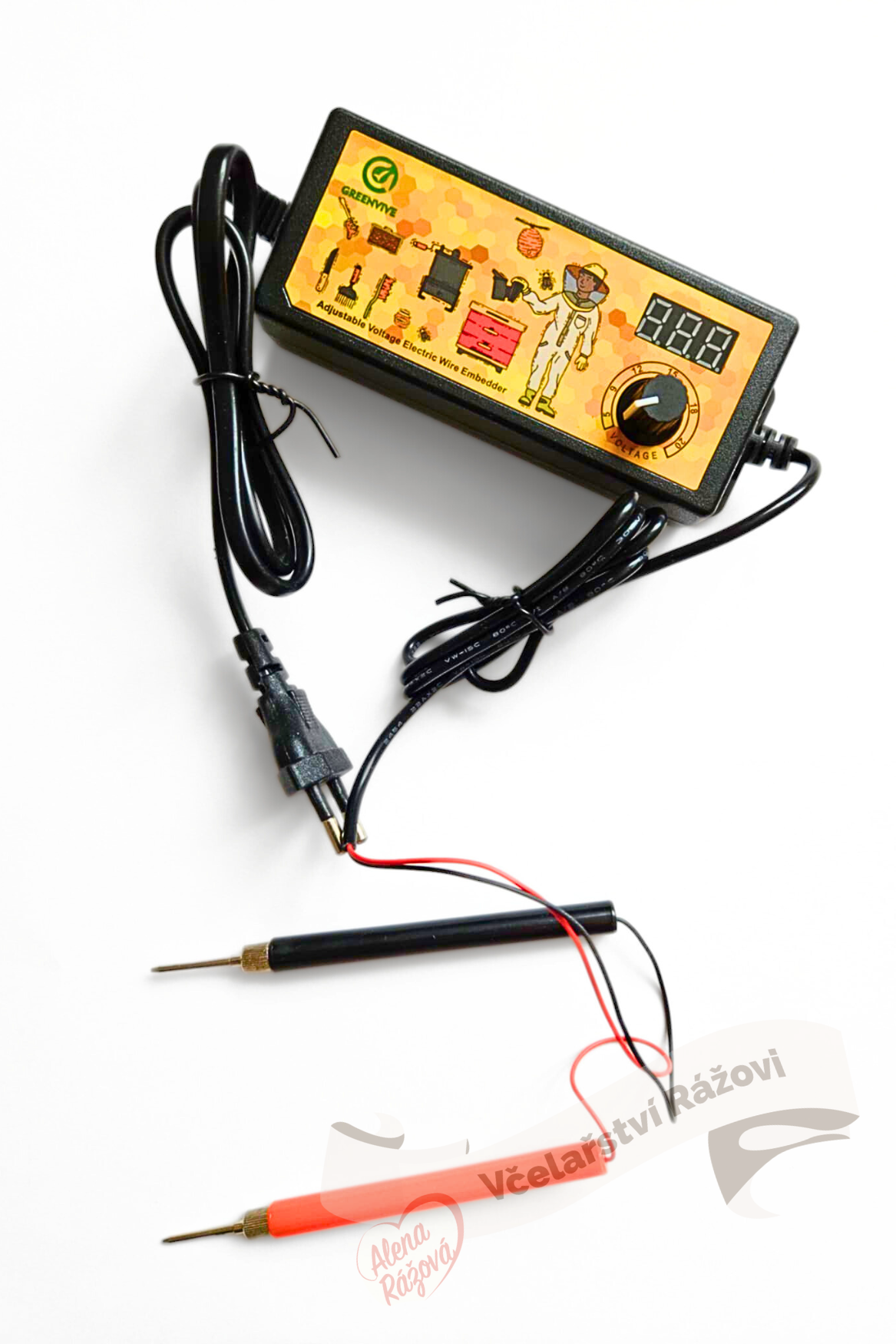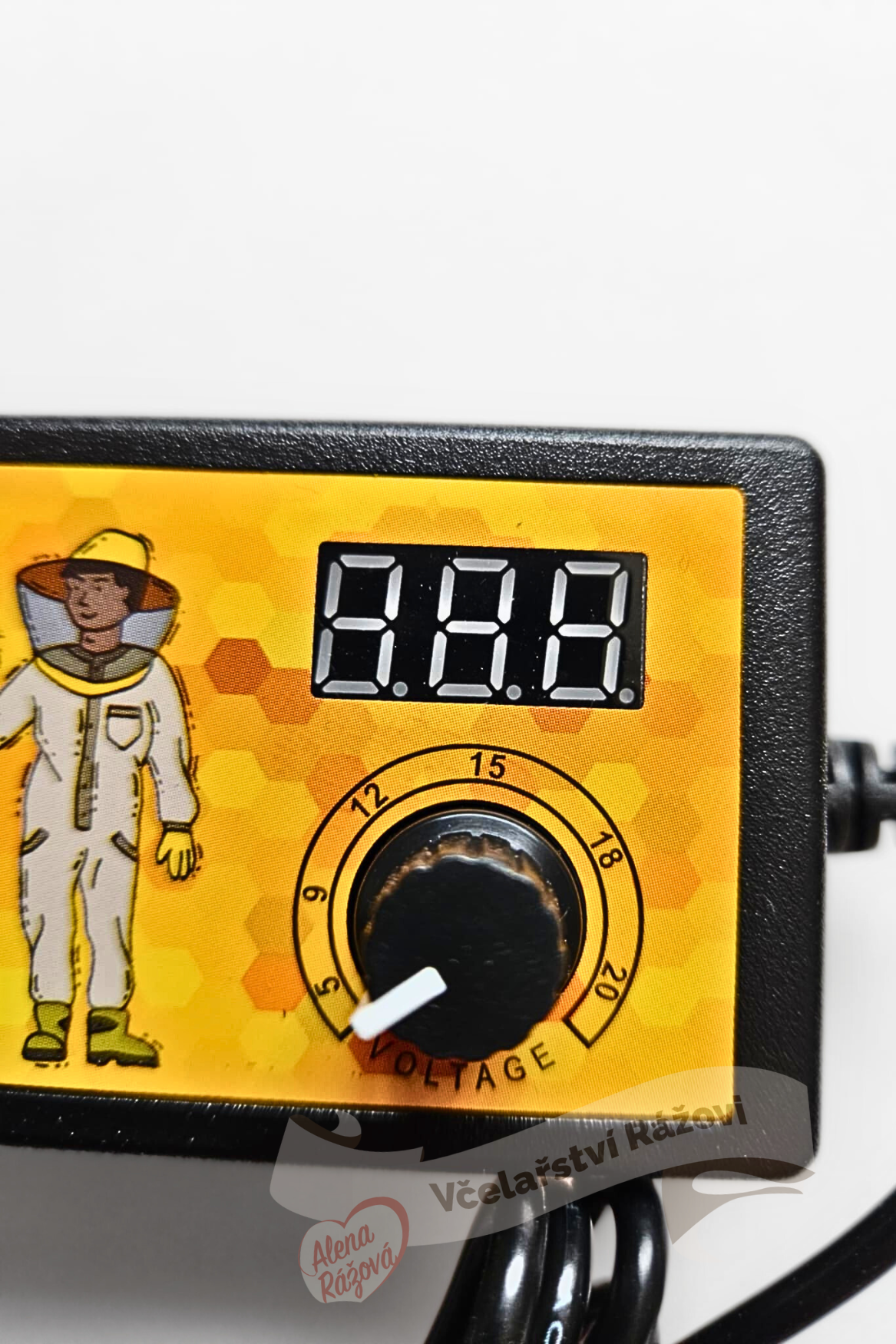 Po položení mezistěny do rámku, přiložte svorky na konce drátku. Nastavte otočný přepínač na cca 10-13 V. Drátek se zataví do mezistěny. Pokud se drátek zatavuje rychle, otočte PROTI SMĚRU hodinových ručiček k minimu. Pokud chcete zrychlit zatavení drátku otočte k maximu.