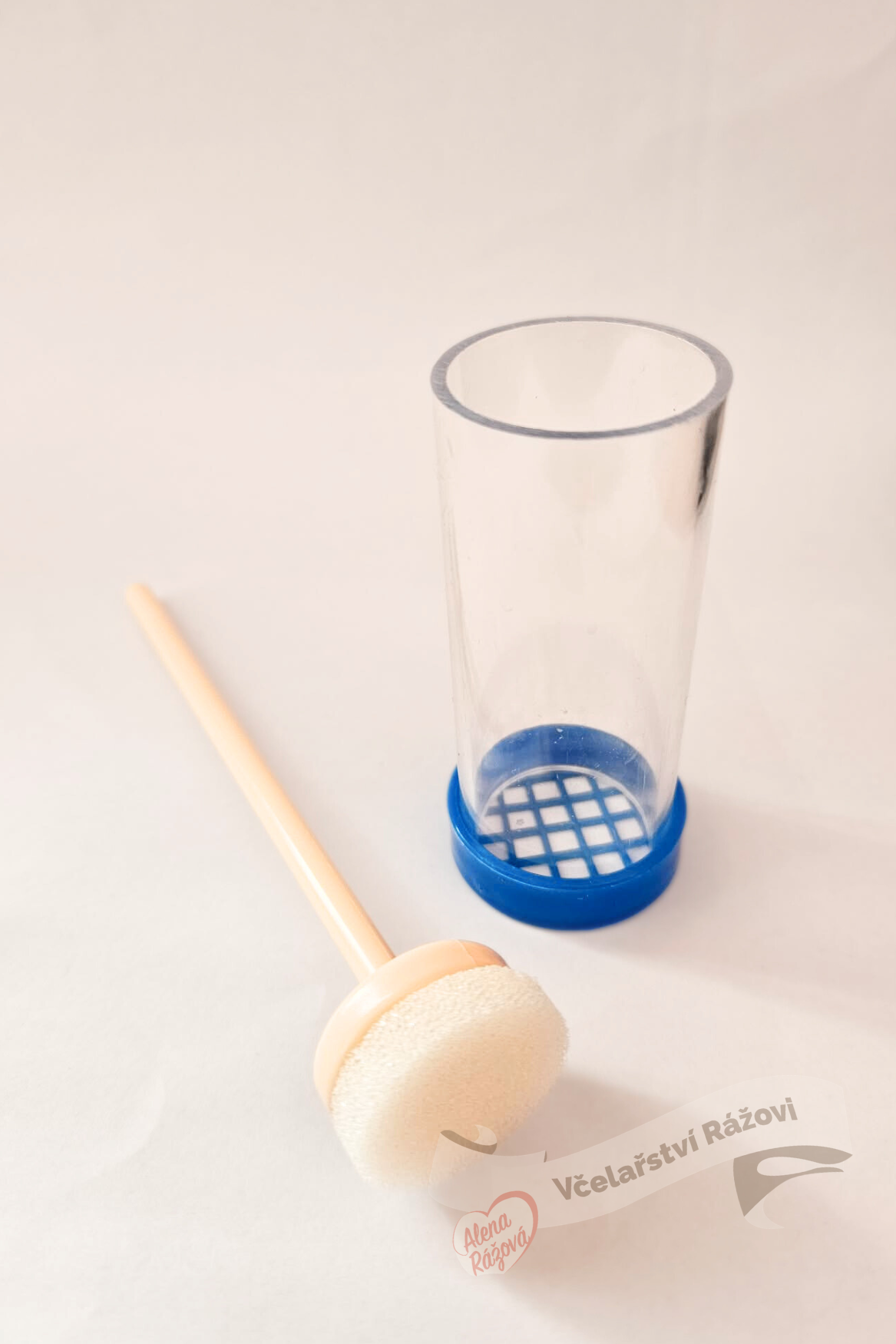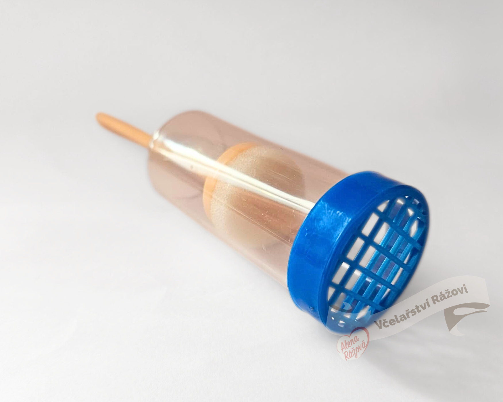 Značící a vychytávací pístek k značení včelích matek Jednoduchá pomůcka pro všechny včelaře, kteří si sami značí matky. Slouží k šetrnému odchytu matky z úlu a k jejich značení. Značící a vychytávací pístek se jednoduše ovládá a díky jeho lehké plastové konstrukci nehrozí poškození samotné matky. Povytažený pístek položíme na plást a mírným tlakem a posunem pístku donutíme matku vlézt dovnitř. Dalším posunem pístku matku přitiskneme na síťku, přes kterou ji můžeme jednoduše označit barvou nebo číslem. Samotný pístek je z molitanu, takže se nemusíme bát, že bychom matce ublížili. Odtažením pístku matku povolíme a v úlu můžeme pístek povolit tak, aby se matka přes otvor dostala ven.